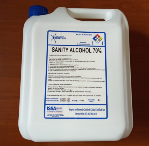 Alcohol al 70% de 5 litros, es una solución hidroalcohólica para limpieza y desinfección inmediata de manos, superficies y ambientes. Dada su concentración alcohólica destruye bacterias, virus y hongos. Las soluciones alcohólicas al 70% son recomendadas por la Organización Mundial de la Salud (OMS) como una efectiva herramienta de desinfección contra el COVID-19 tras haber limpiado una superficie, recomendando un tiempo de contacto de 1 minuto. Debido a su evaporación rápida no tiene efecto residual en las superficies de contacto. una vez aplicado se evapora rápidamente Totalmente biodegradable.